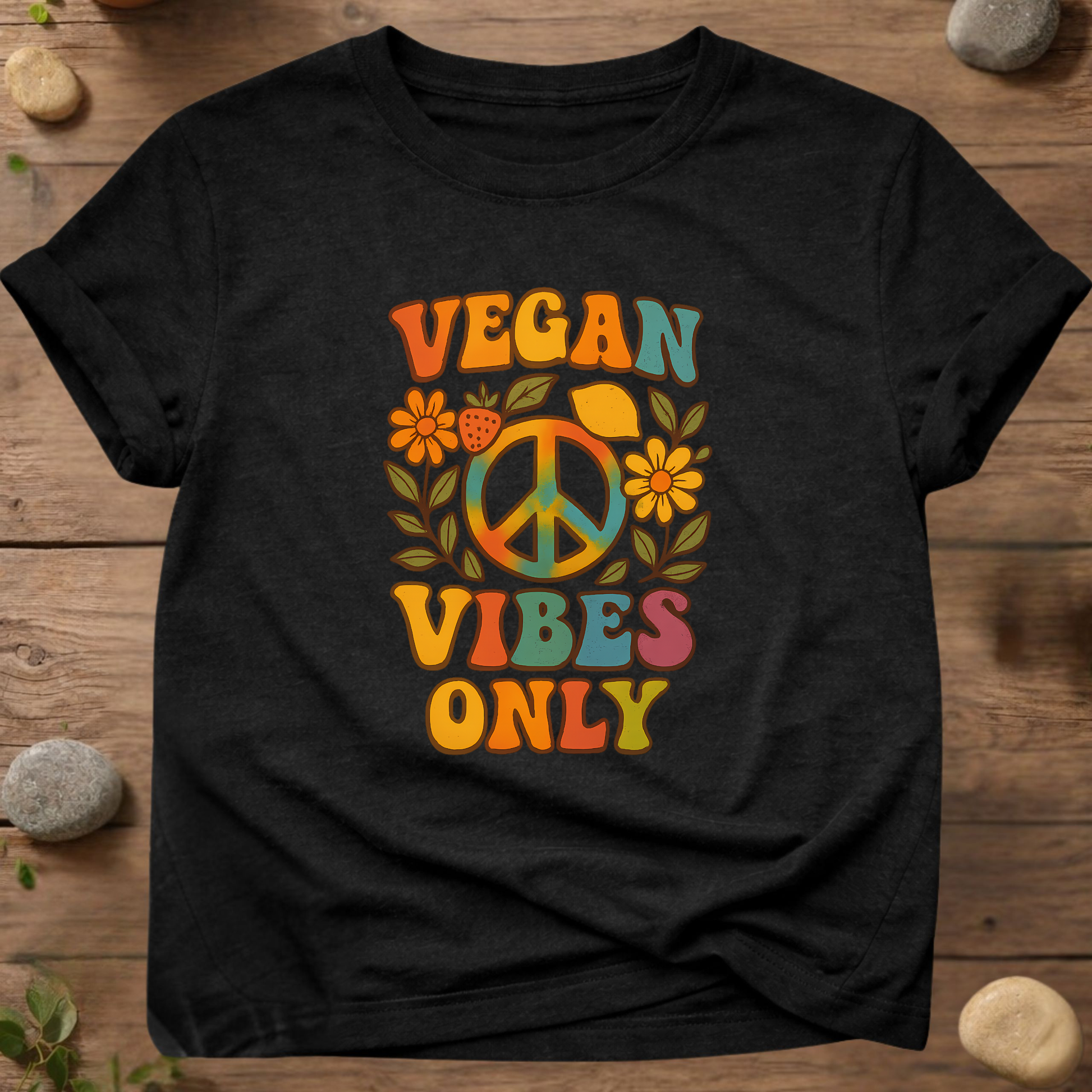 Vegan Vibes Only T-shirt – Retro Peace & Plant Power graphic op een Stanley/Stella biologisch katoenen T-shirt