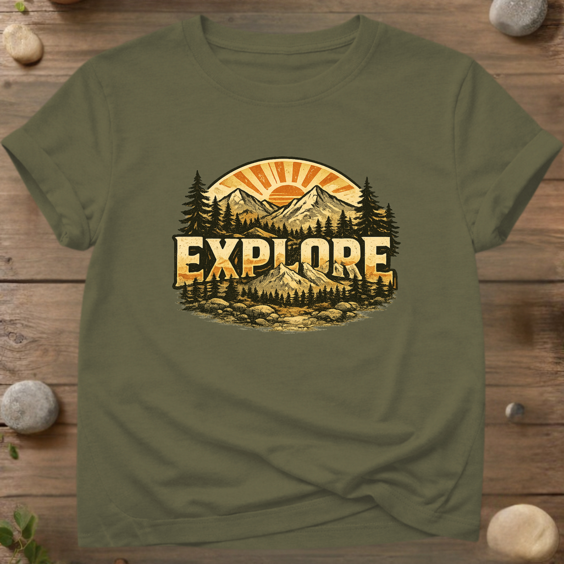 The Explore the Wild T-Shirt features a bold vintage-style mountain landscape with rising sun rays and dense pine forests, centered around the powerful word EXPLORE. This timeless design represents freedom, curiosity, and the endless desire to discover what lies beyond the next trail.