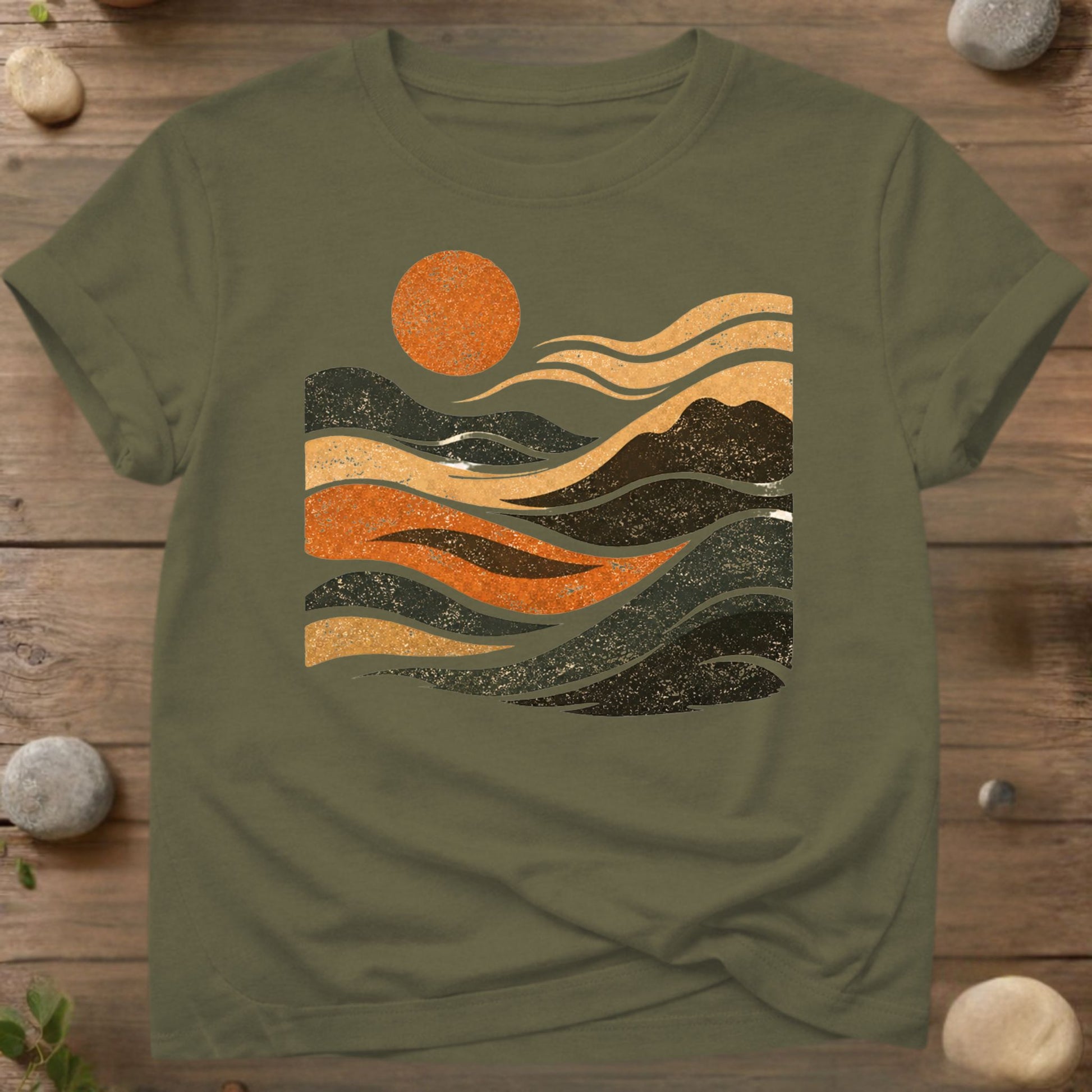 Flowing Horizons is an abstract landscape inspired by rolling hills, moving water, and a setting sun. Layered shapes and earthy tones create a sense of rhythm and calm, capturing the ever-changing beauty of the natural world.