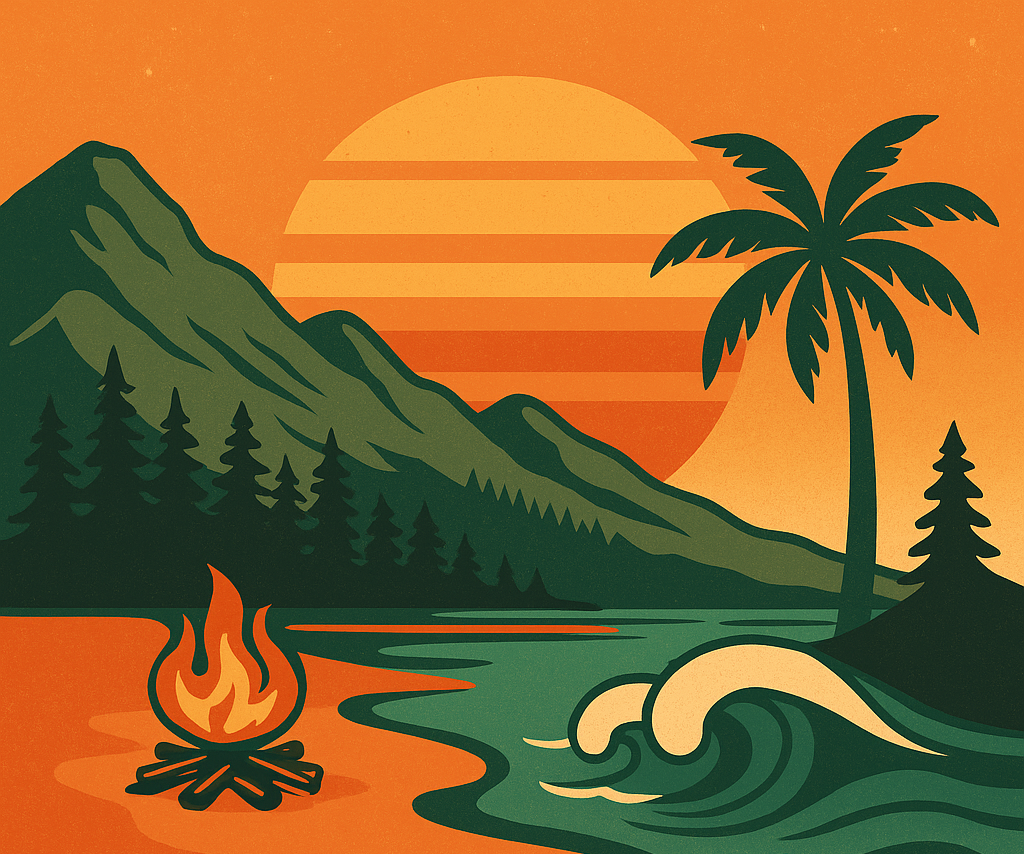Palms, Sea & Sunsets T-Shirt – Retro Tropical Sunset Tee on Stanley/Stella Organic Cotton